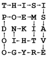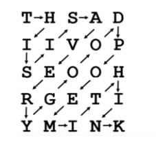 小Y把走过路径的字符串起来,就得到了一个长度为 n*n 的字符串“THISISAVERYGOODPOEMITHINK”,这是密码的中间形式,而小Y需要把这个密码排列成最终形式,最终形式是把这个中间形式的密码按照螺旋矩阵的方式填入一个 n*n的矩形中,如下图所示,从第一行第一个字符开始,第一步开始一直向右走直到碰到边界或是已有字符 ,再向下走到边界或已有字符,再向左走到边界或已有字符,再向上走到边界或已有字符… … 不断重复这个过程直到无路可走停止。