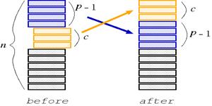 一副牌有n张牌。从上往下数第p张牌开始,往下总共取c张牌,拉出来放到顶上,就像图一这样。这样的操作叫做一次剪切操作,重复这样的操作。