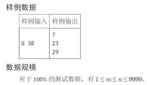 输入一行两个用空格分隔的正整数m,n,表示我们希望求幸运素数的范围。