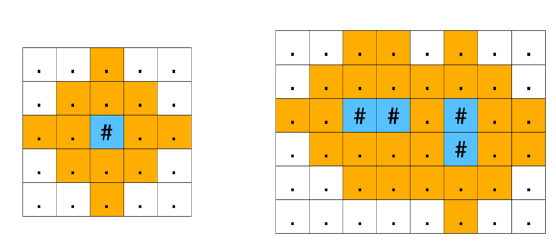 虽然卫星照片可以清楚地辨别出陆地和水域,但陆地的具体类型却并不明确。现在我们了解到,对于一块是水域的方格,它向上、下、左、右四个方向k步之内可达的陆地格子,均会形成沙滩。例如,下图展示了k=2的情况,蓝色的格子代表水域,标为黄色的陆地格子是沙滩: