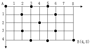 B 点。卒行走规则:可以向下、或者向右。同时在棋盘上的任一点有一个对方的马(如图的C点),该马所在的点和所有跳跃一步可达的点称为对方马的控制点。例如图中C 点上的马可以控制 9 个点(图中除A,B之外的黑点)。卒不能通过对方马的控制点。
