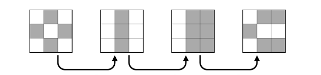 初始棋盘白黑相间,第一次操作后有3个同颜色的联通区域,第二次操作后有2个同颜色的联通区域,第三次操作后有6个同颜色的联通区域。