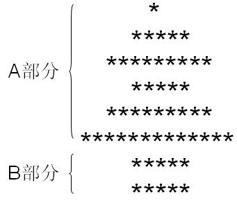 因为圣诞树是中轴对称的,所以根据所有的参数构成的圣诞树是唯一确定的。简单来讲,我们所说的一棵圣诞树就是像图那样的*矩阵,每一行的字符是指若干个连在一起的*。